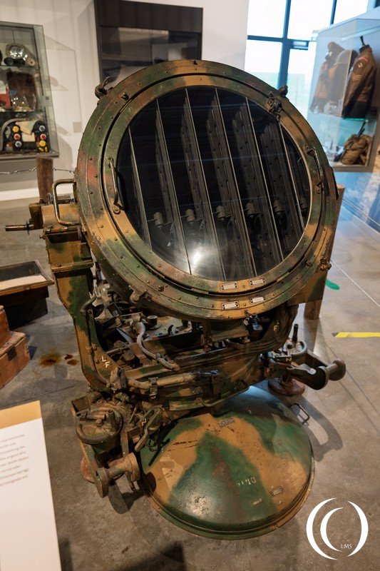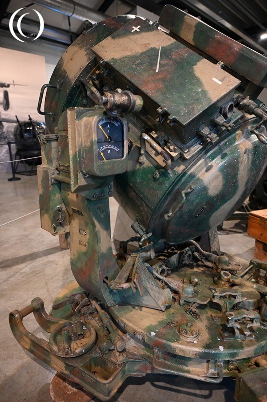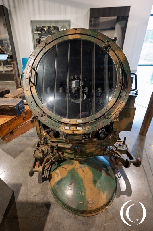 The 60 cm projector is equipped with a 60 cm diameter parabolic reflector lens. The focal length is 250 mm. As with heavier projectors, the high-density arc lamp is mounted inverted within the projector. The diffused light intensity is 135 million candela. Under favorable weather conditions, the light beam can be carried to a maximum altitude of 5200 m. The optimal operating altitude is 1500 m. However, with beam dispersion, target detection is possible at distances of up to 3500 meters. The power consumption is 90 amperes at 60 volts. Thanks to the handles implemented by the room manager seated behind the projector, the projector can be manually aligned on-site and in azimuth. The beam can be blocked by a shutter.