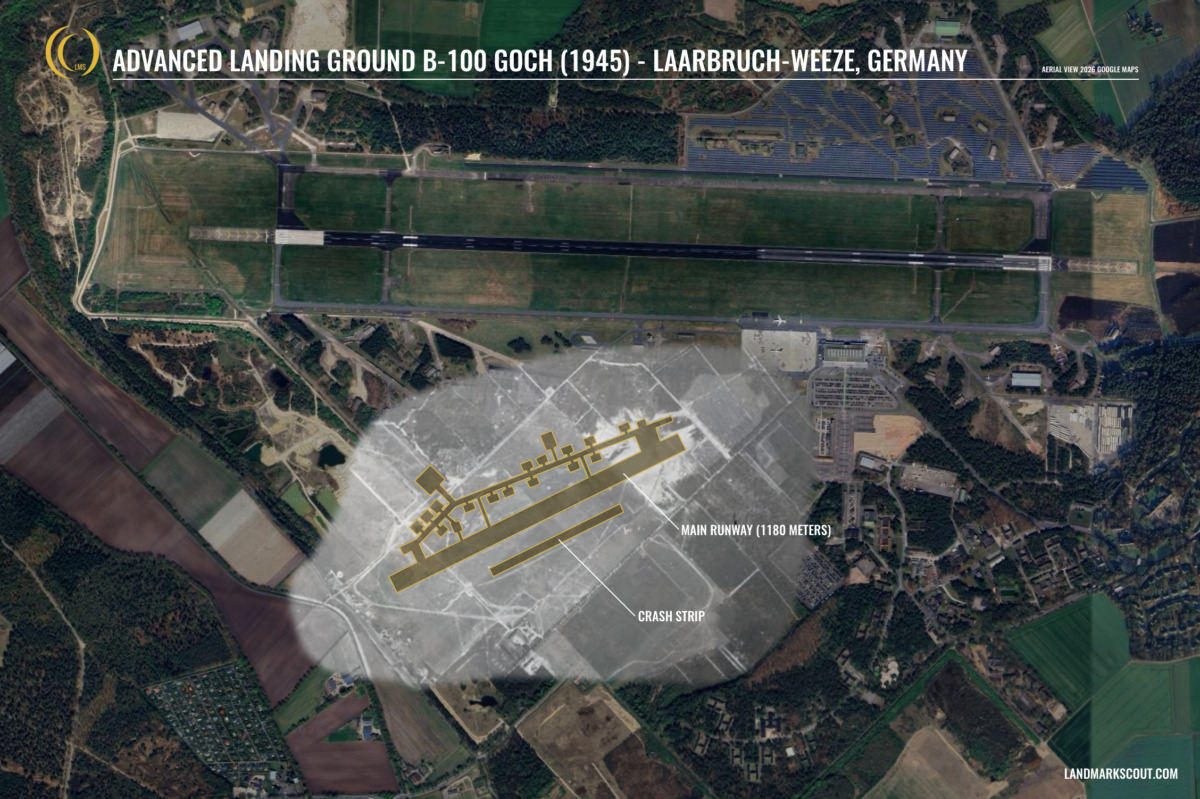 Although all remnants of ALG B-100 Goch have disappeared over the years, you can still visit the Royal Air Force Museum Laarbruch-Weeze on the Airport grounds. They have a small exhibition about the subject.