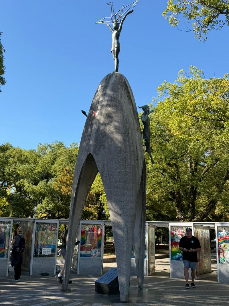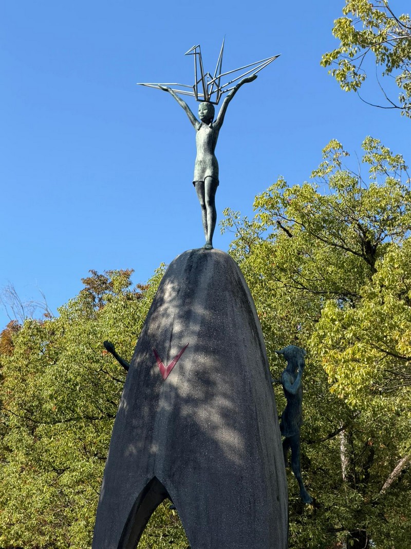 The Children’s Peace Monument in Hiroshima was built to honor the memory of all the children who died as a result of the atomic bombing in 1945. It was inspired by Sadako Sasaki, a young girl who developed leukemia and folded paper cranes hoping for recovery and peace. The monument features Sadako holding a golden crane above her head, symbolizing hope and peace. Surrounded by thousands of colorful paper cranes sent from around the world, it stands as a powerful call for global harmony and nuclear disarmament.