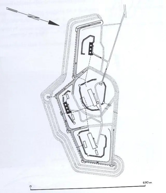 Two blockhouses for the outer guard cover the approach road. The two armored batteries are each equipped with three turrets for a 10 cm short-barreled gun. The eastern battery is located on the forward wall. One of the group’s three artillery observers is on the left side of the battery. The second is located in front of the eastern battery in the peripheral defense network, and the third is located on the right side of the infantry parapet of the central barrack.
