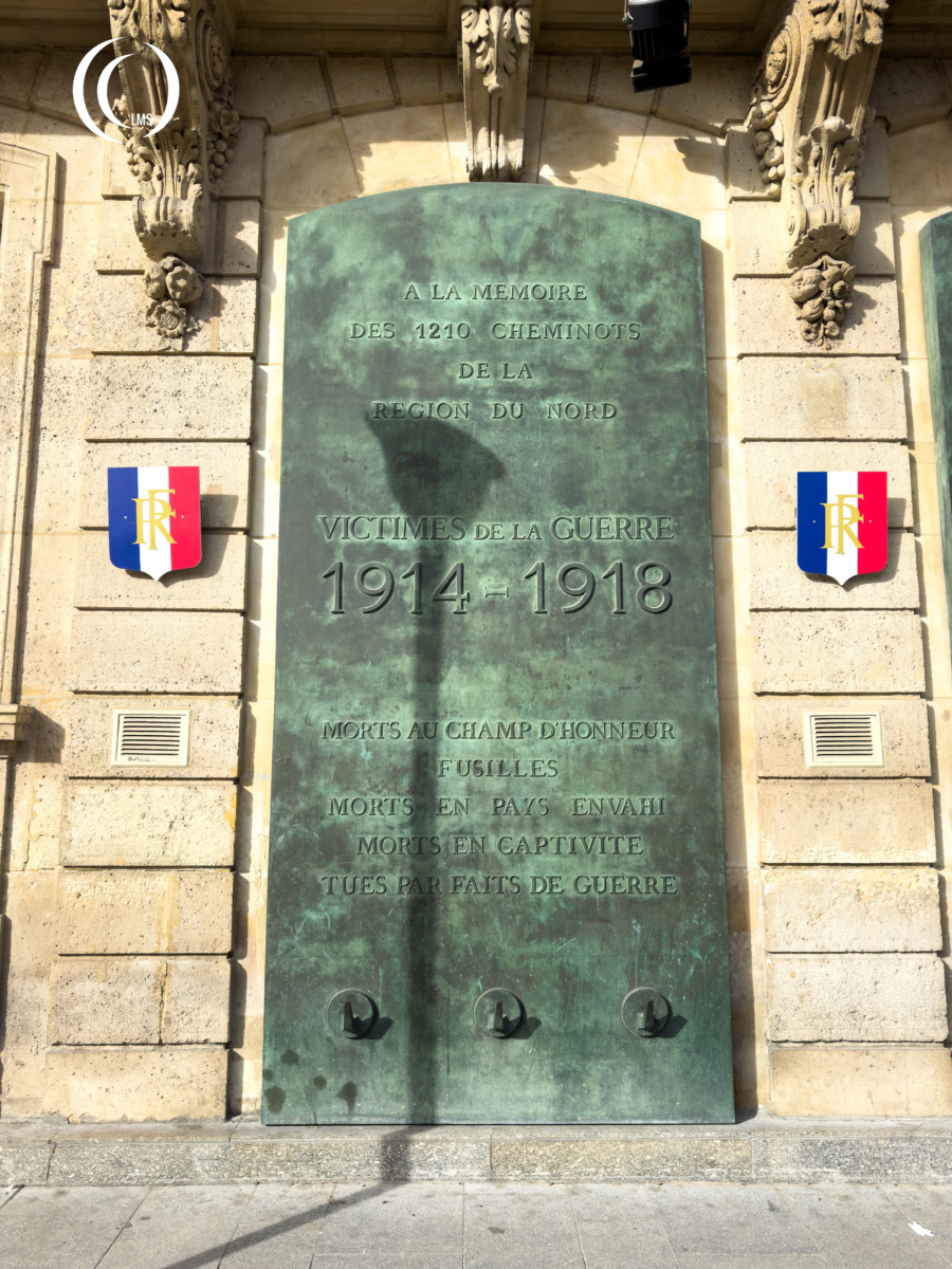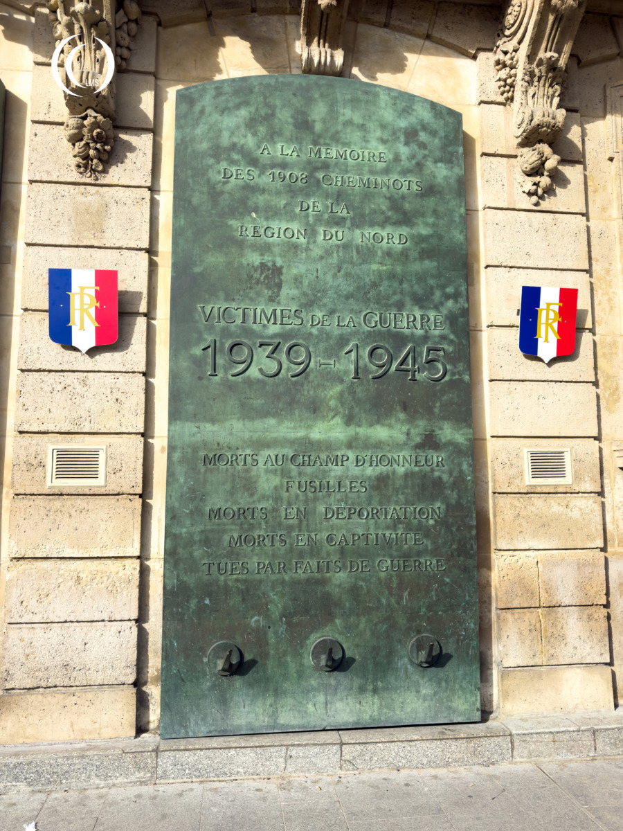 This memorial commemorates the fallen Railwaymen of Paris North Railway Station during both world wars. The left plaque commemorates 1210 victims of WWI and the right plaque 1908 victims. The railwaymen either fell performing their duty or in captivity.