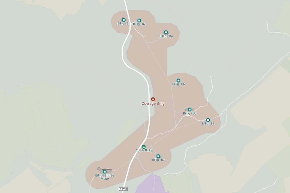 Between Gros Ouvrage Hackenberg and Fort de Koenigsmacker, originally a German fort, the French constructed Fort Billig. Although Billig is a Gross Ouvrage or large fort it lacks the usual 2nd main entrance. Gross Ouvrages have a separate entrance for personnel (des Hommes) and an entrance for ammunition. Billig has a combined entrance and its connecting tunnel from the main entrance to the blocks is 1000 meters (3300 ft) long which is a bit short for a Gros Ouvrage. Construction started in 1930 and the fortress was finished in 1935.