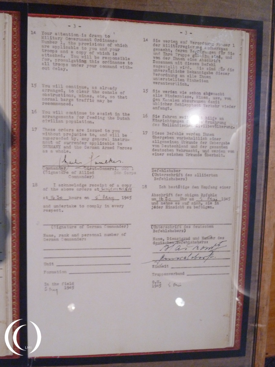 The Orders on the Surrender were formally signed on 6 May 1945 (although the document often bears the 5 May 1945 date). The signing took place not in Hotel de Wereld but in the auditorium (aula) of the Landbouwhogeschool (Agricultural College) next to the hotel in Wageningen.