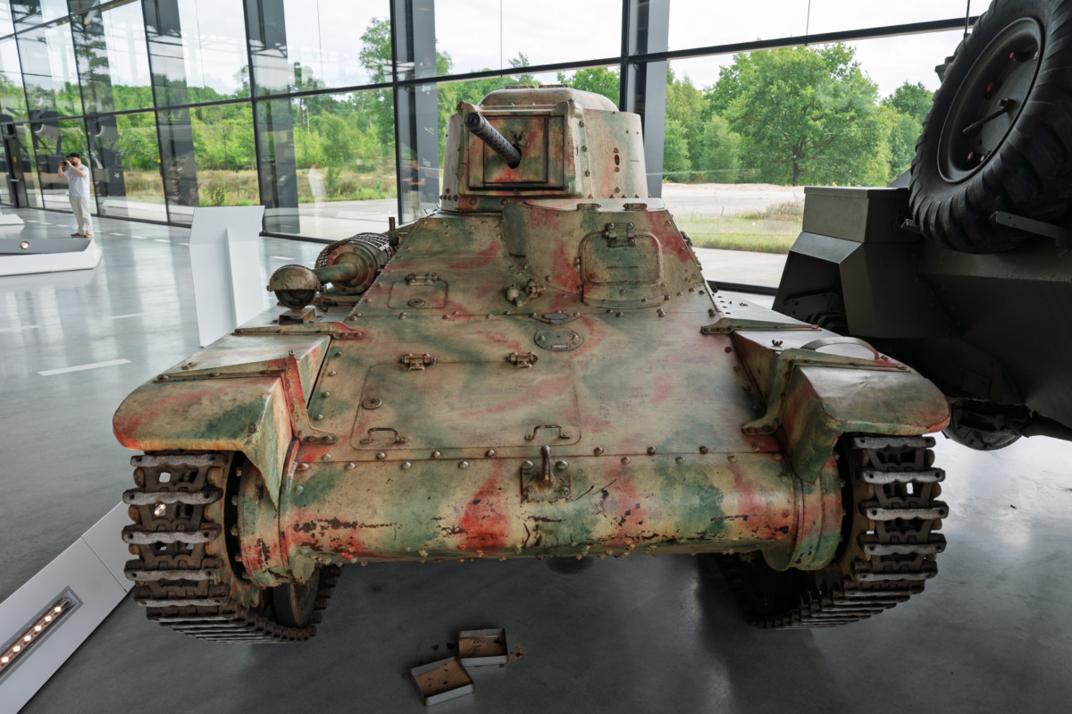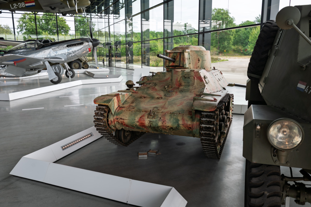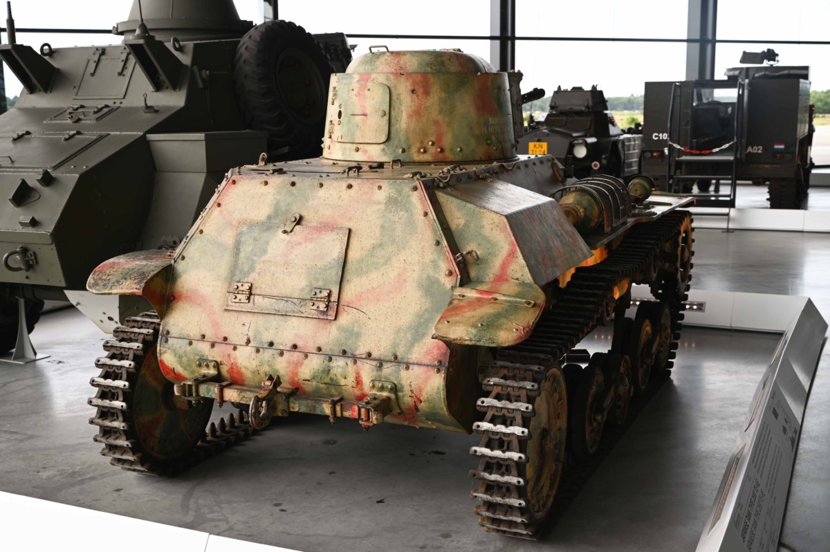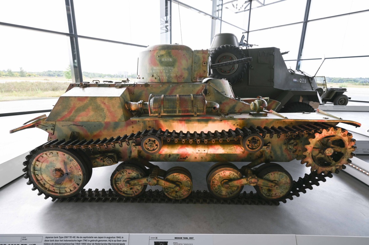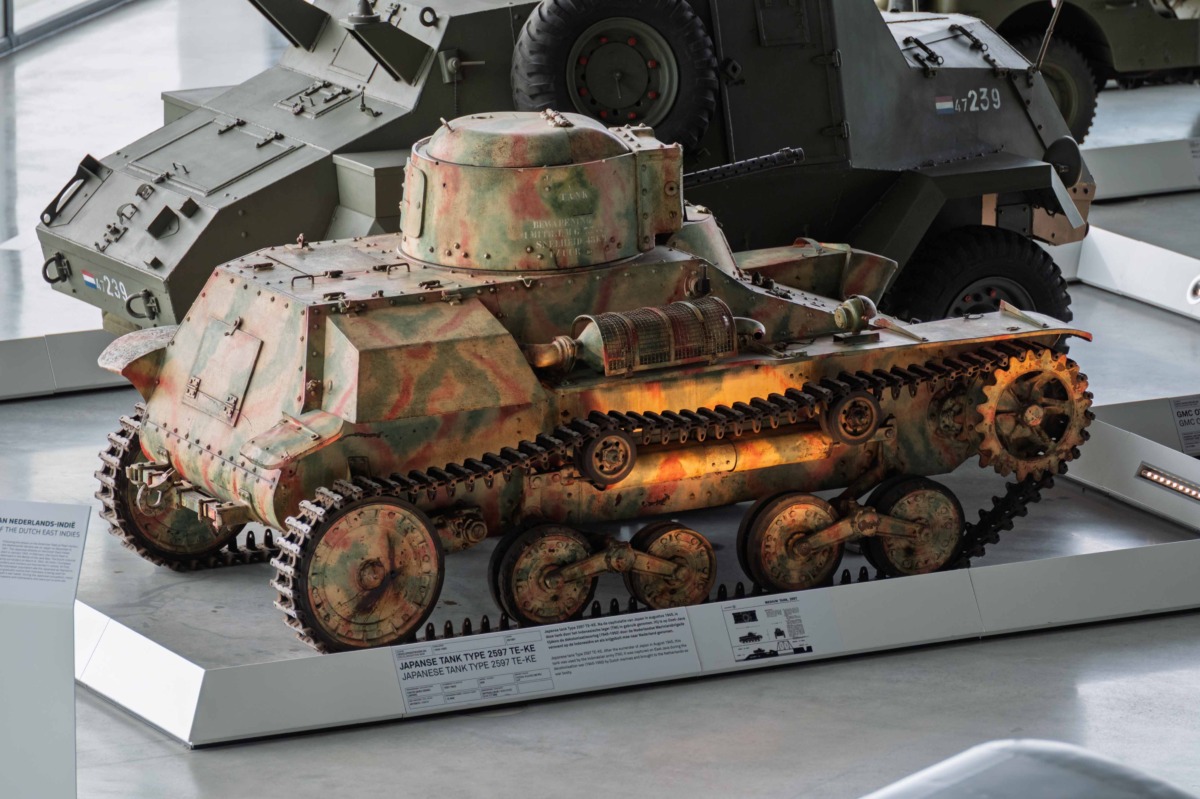 The Type 97 Te-Ke was photographed in the Nationaal Militair Museum, in Soesterberg, the Netherlands. The Japanese vehicle was built in Japan during WW2. After the defeat of Japan 1945, it was left behind in Indonesia and became part of the Indonesian army. In 1947, it was captured by the Dutch marines on East-Java, during the Indonesian National Revolution (decolonisation war 1945-1950) and was shipped back to the Netherlands. The camouflage isn’t Japanese, it was applied by the Indonesians after the Decond World War, the tankette is armed with the 7,7 mm machine gun instead of the 37 mm gun.