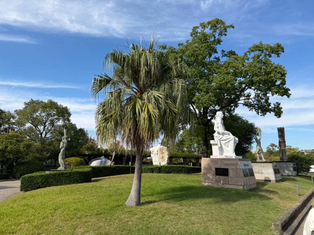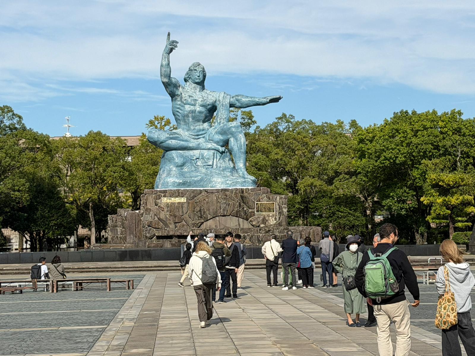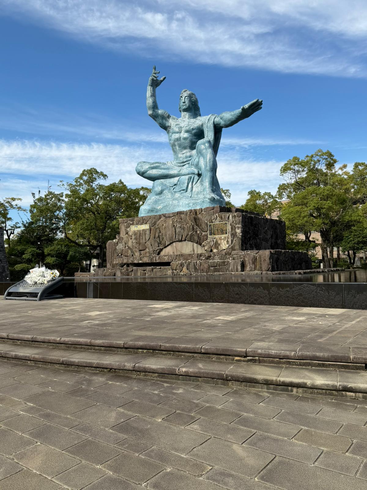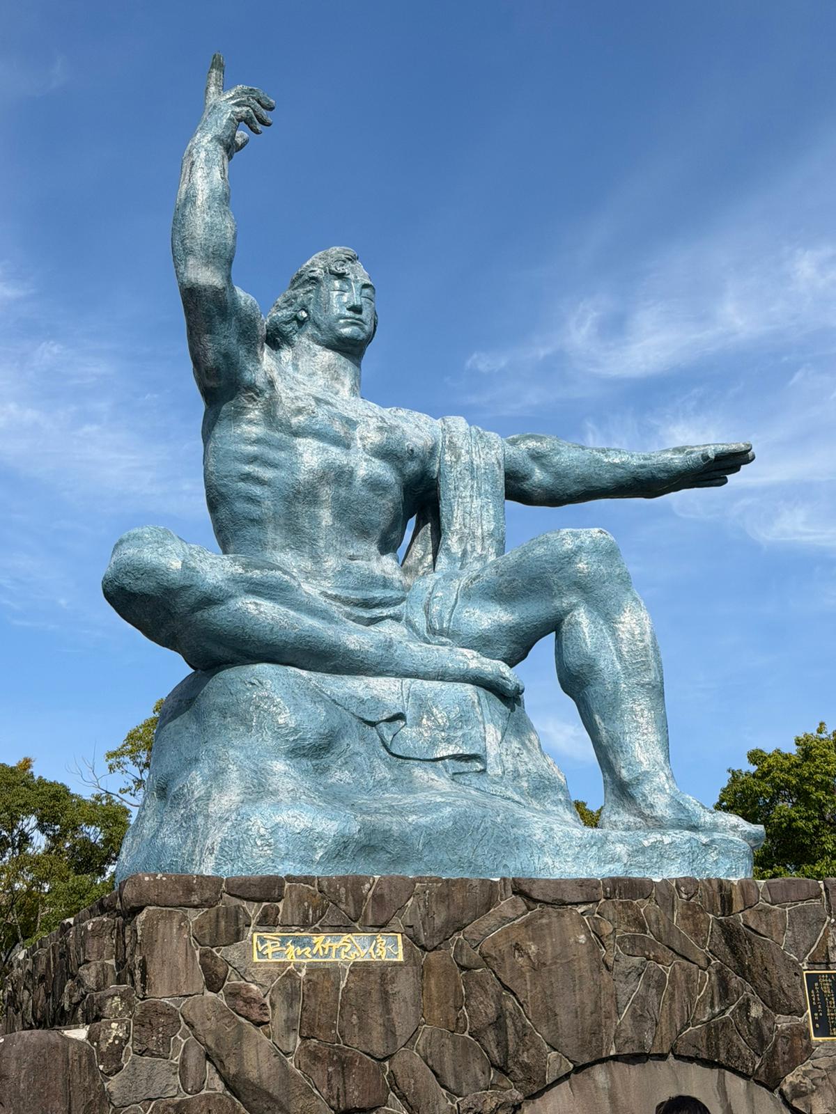 Nagasaki Peace Park (長崎平和公園) is a memorial site in Nagasaki, Japan, dedicated to the victims of the atomic bombing on August 9, 1945. Built in 1955, the park symbolizes remembrance, resilience, and hope for lasting peace. Its centerpiece, the Peace Statue by Seibō Kitamura, features a raised right hand pointing to the threat of nuclear weapons and a left hand extended in peace. The park also includes the Fountain of Peace, memorials donated from around the world, and the nearby Atomic Bomb Hypocenter Monument marking the explosion site. Every year on August 9, the Nagasaki Peace Memorial Ceremony is held here, drawing visitors worldwide to honor the victims and renew the pledge for nuclear disarmament and global harmony.