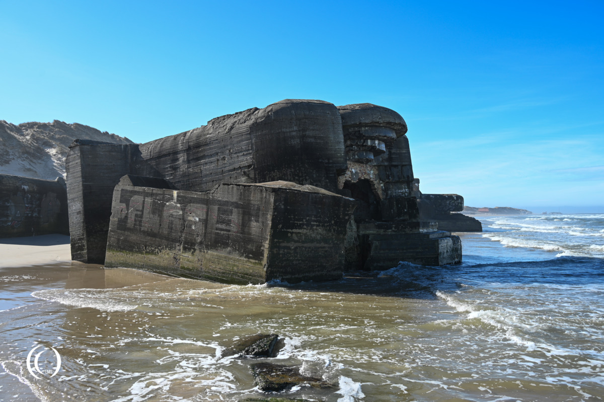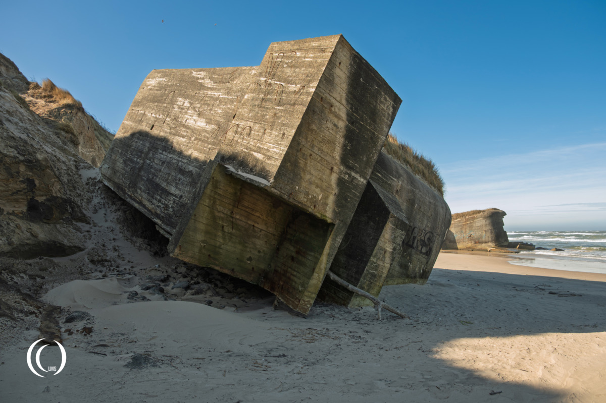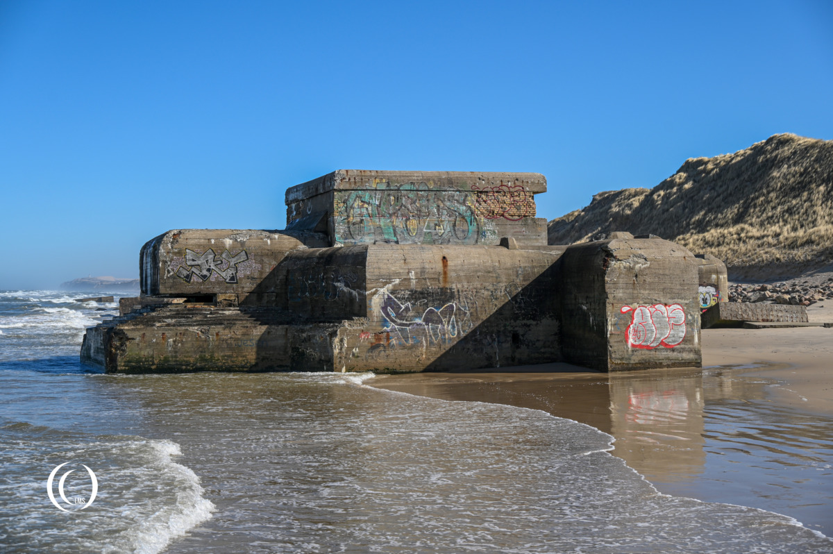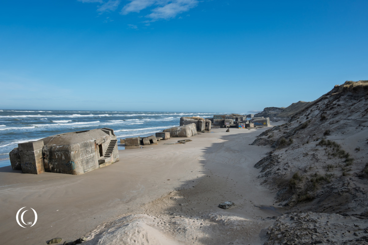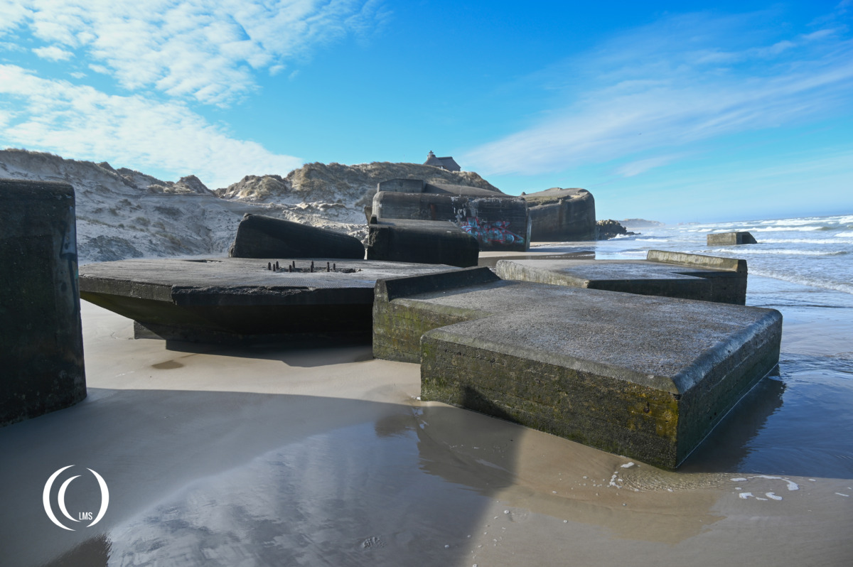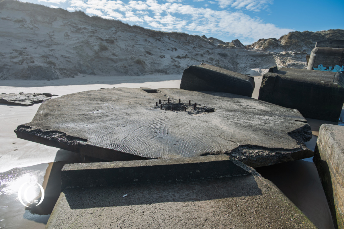 Although the coastal battery was built in the dunes behind the beach during World War Two, erosion of the coastline over the years has caused the dunes to recede for 90 meters, leaving the bunkers on the beach and slowly slip into the sea.
