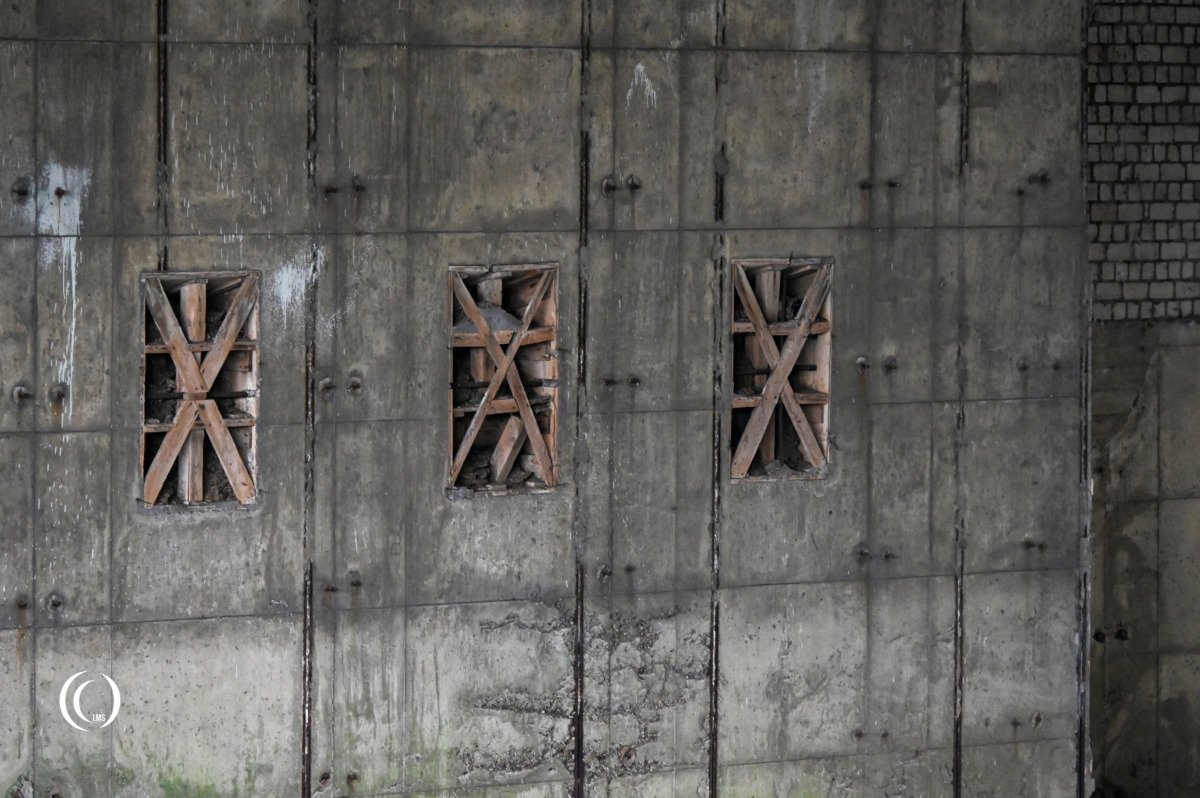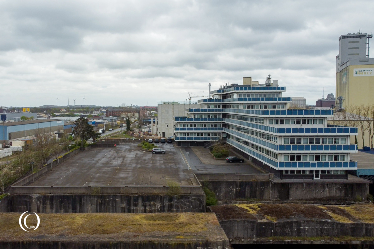 In March 1945 the port area in the west of Bremen became the target of the last heavy air raids on the city. During the daylight attack of 21 March 1945 the Hornisse construction site barely escaped the bomb carpet (picture above). But a week later on the 30th several bombs detonated on the bunker roof of Hornisse, which severely damaged it. A huge piece of the bunker roof on the south wall was blown off.