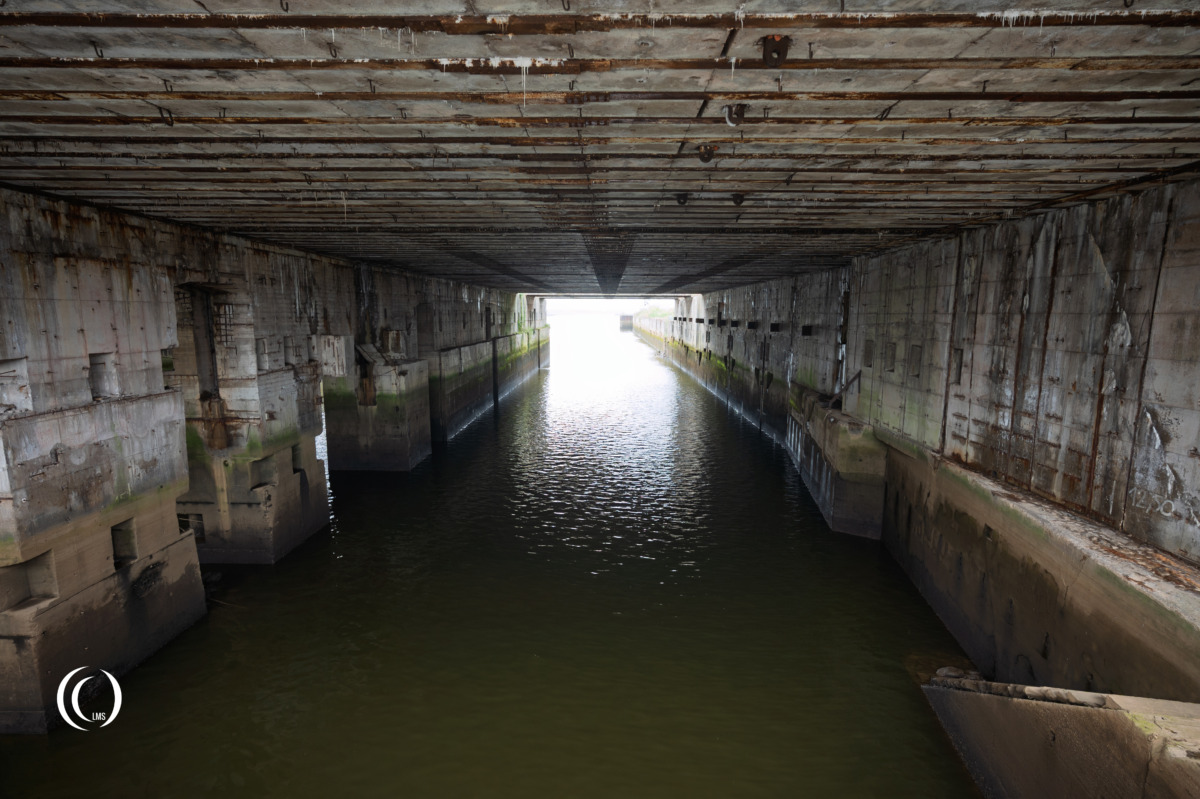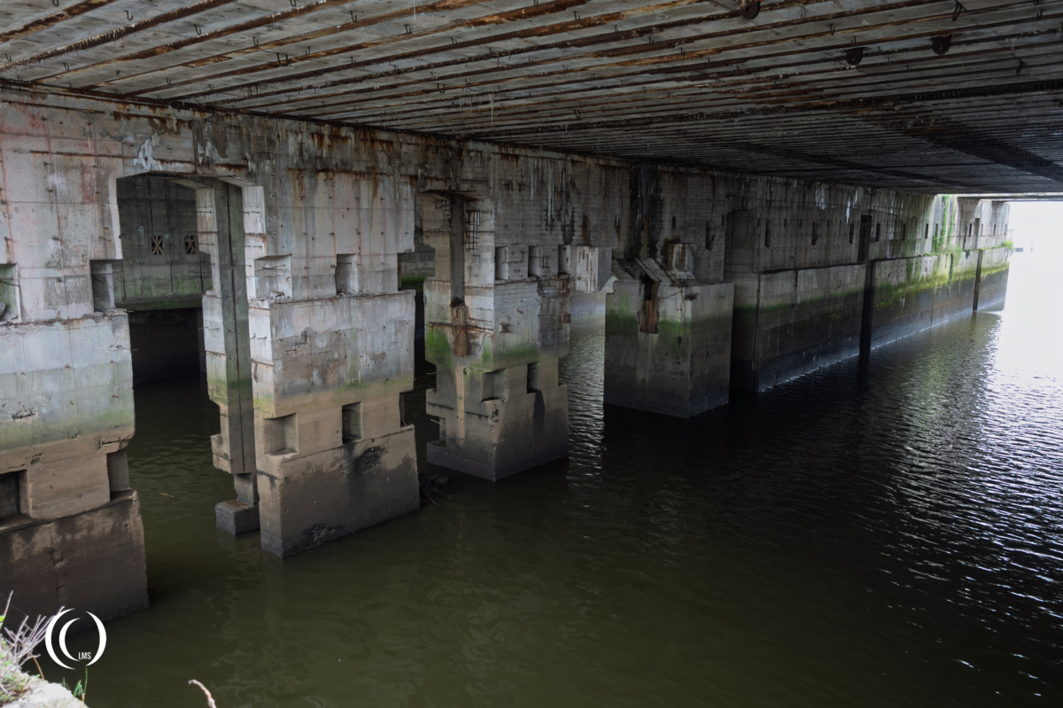 Hornisse would have to perform a multi-role as u-boat production and repair yard. The production would focus on three sections of the new class XXI u-boats. To achieve this the bunker would consist of 4 parts with a length of 370 meters and a width of 65 meters. A center wall was constructed along the length of the bunker to support the 4.5 meters thick reinforced concrete roof, dividing it into two chambers connected by openings in the middle wall. A lock would provide access to and from the Weser river.