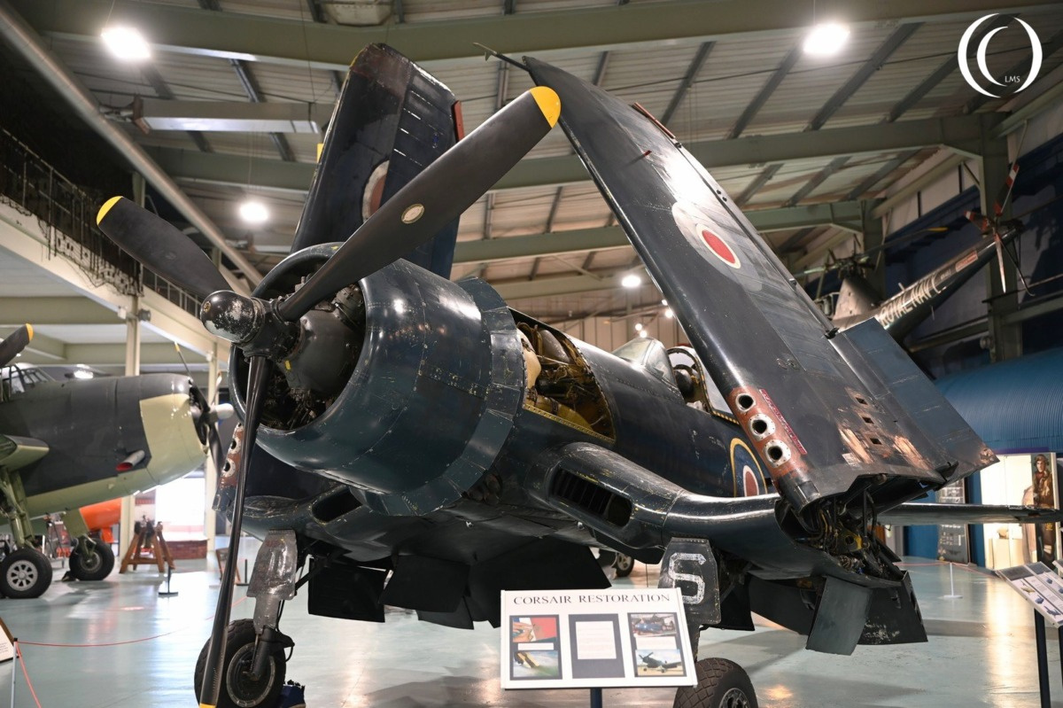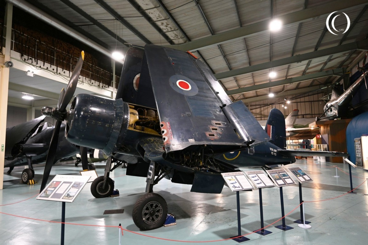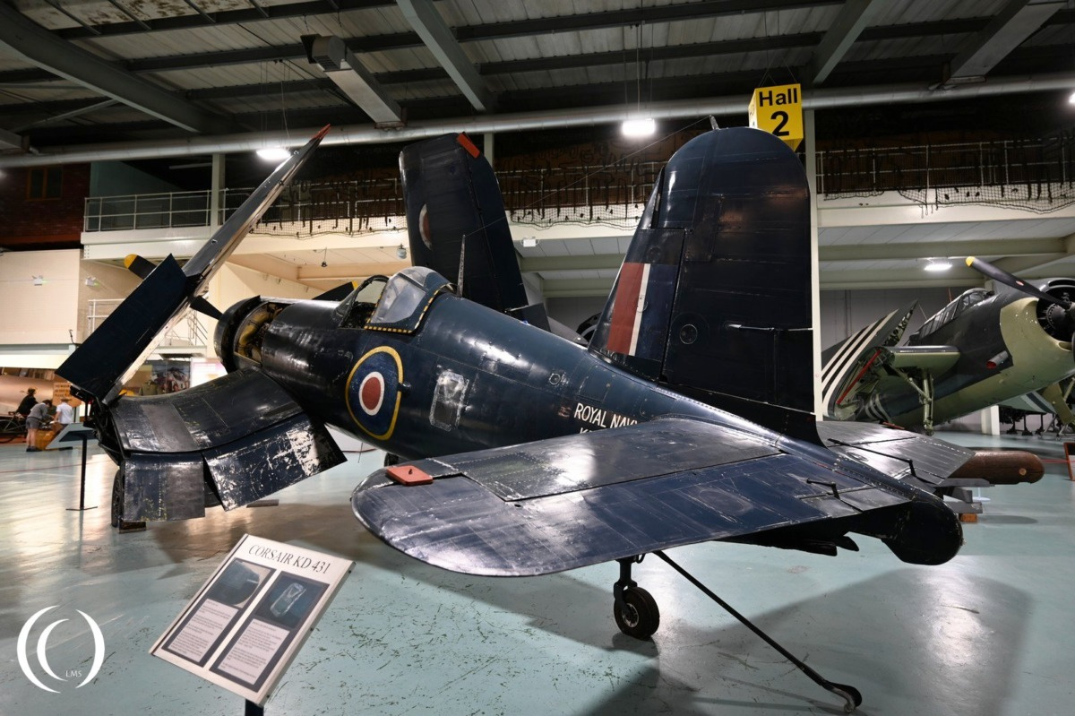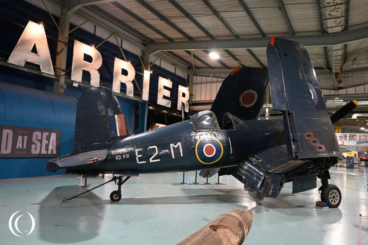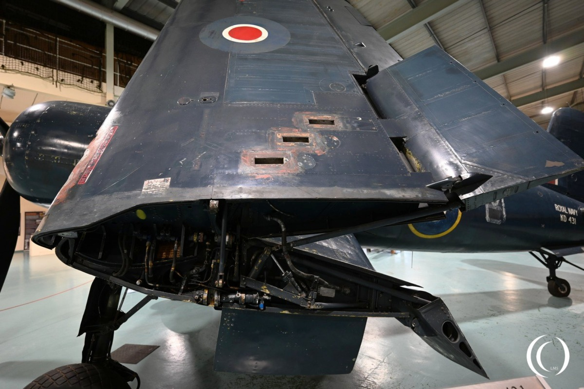This aircraft in the photos bearing construction number 1871 is a Goodyear-built FG‑1A Corsair, Bureau Number 14862, and served with the Royal Navy as KD431 from late 1944. After its operational period it became a classroom fixture at Cranfield College from 1946. In 1963, it was preserved by the Fleet Air Arm and put on display. It is painted in E2-M markings representing 768 Squadron.