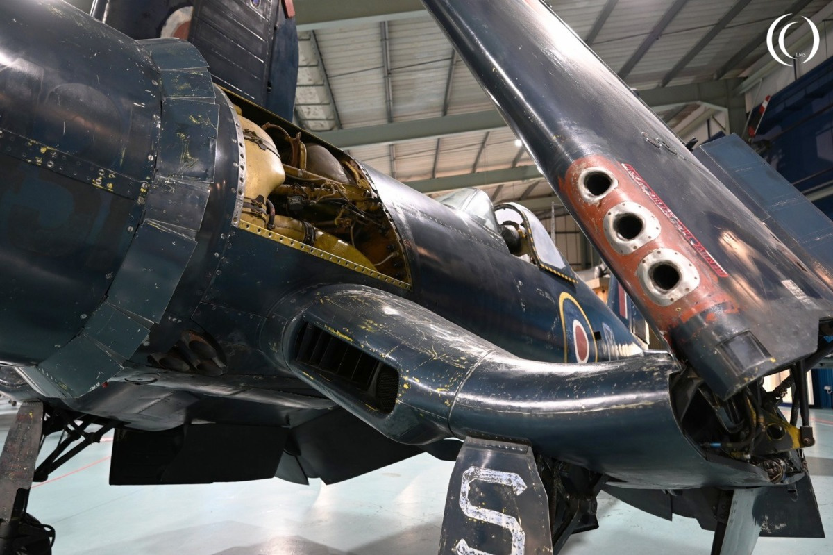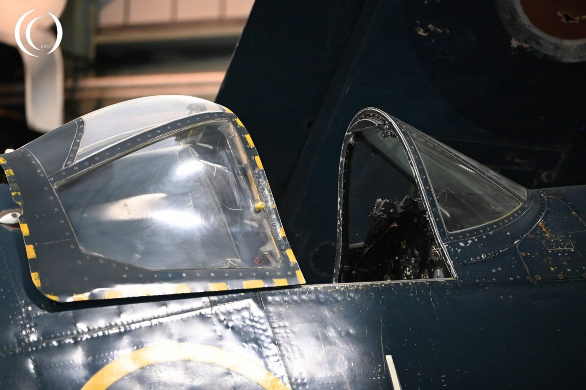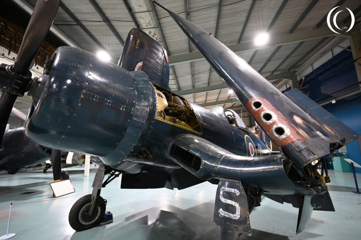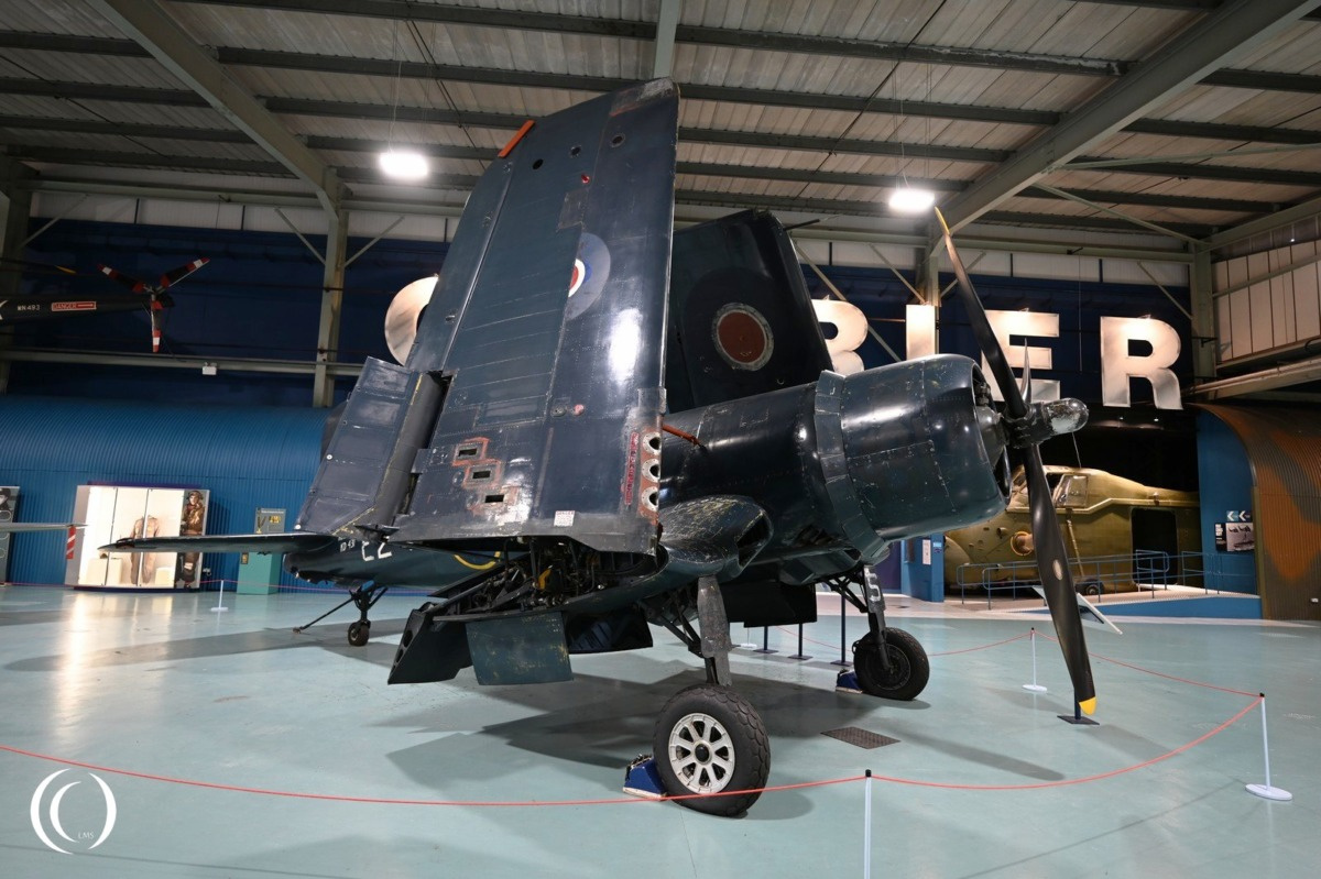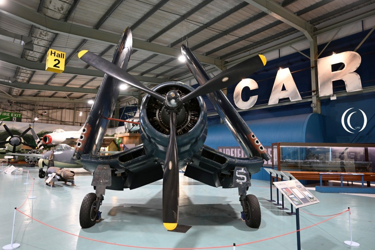 This aircraft in the photos bearing construction number 1871 is a Goodyear-built FG‑1A Corsair, Bureau Number 14862, and served with the Royal Navy as KD431 from late 1944. After its operational period it became a classroom fixture at Cranfield College from 1946. In 1963, it was preserved by the Fleet Air Arm and put on display. It is painted in E2-M markings representing 768 Squadron.
